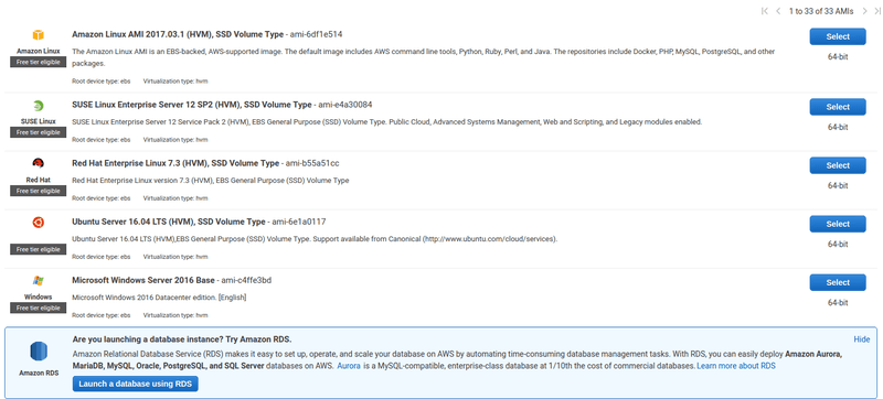 Select Ubuntu server and choose the Free Tier Eligible T2.micro, then click on Next until you reach the security step