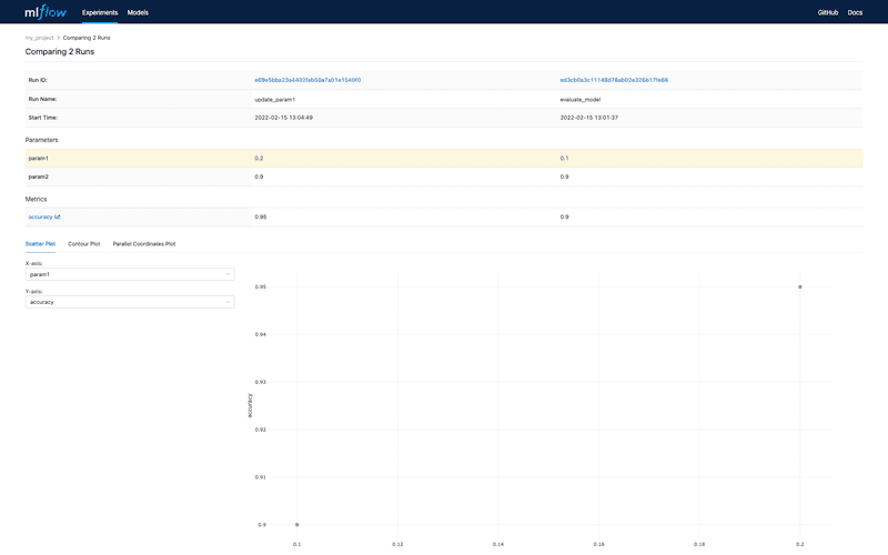 MLflow dashboard also offers possibility to compare several runs together: