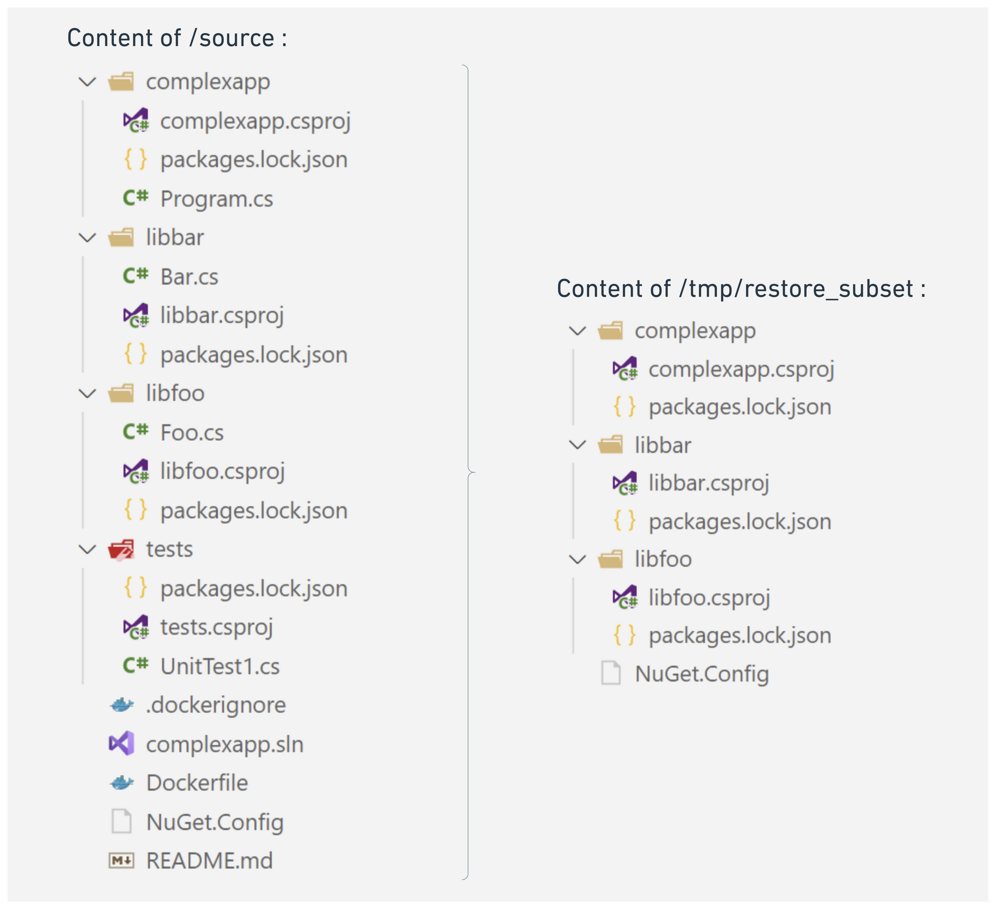 Above is the result of running dotnet subset restore /source/complexapp/complexapp.csproj --root-directory /source/ --output /tmp/restore_subset/